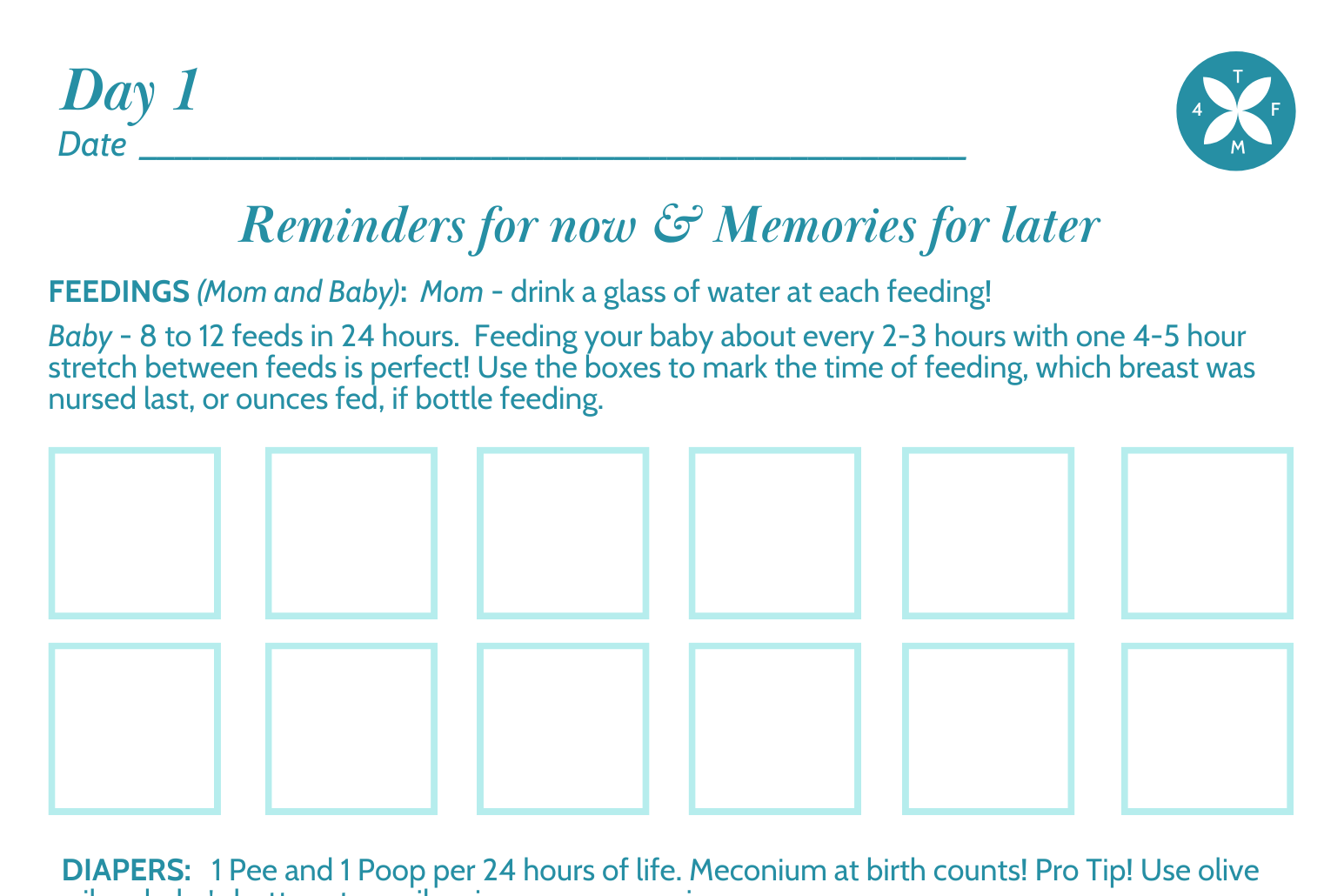 Hmmm… I thought, “If these 3 mommas found this helpful, maybe others will, too. Each day is on a notebook sized piece of paper with places to check of diapers and write in what they were. Another place for nursing or feeding. Another spot for keeping tabs on mom’s bleeding. And tips and words of encouragement for each day, along with reminders and things to look out for.